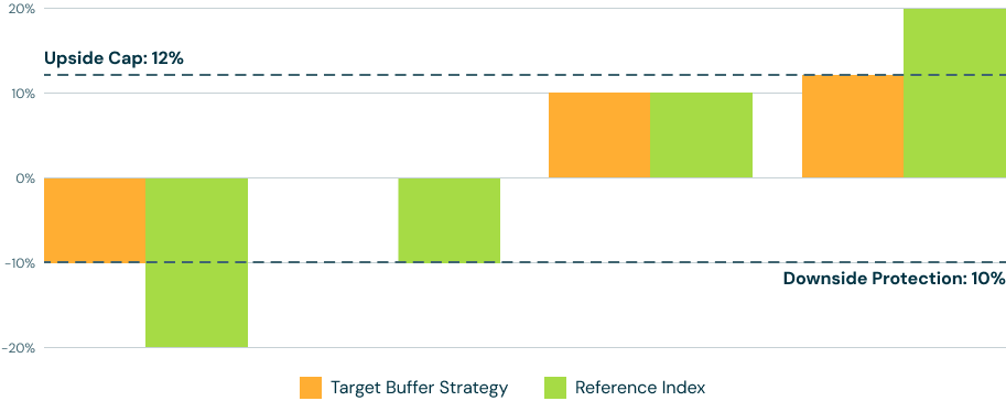 Here’s an example of the outcomes the strategy would seek over the outcome period under different scenarios for returns of the reference asset with an Upside Cap of 12% and a Buffer of 10%.